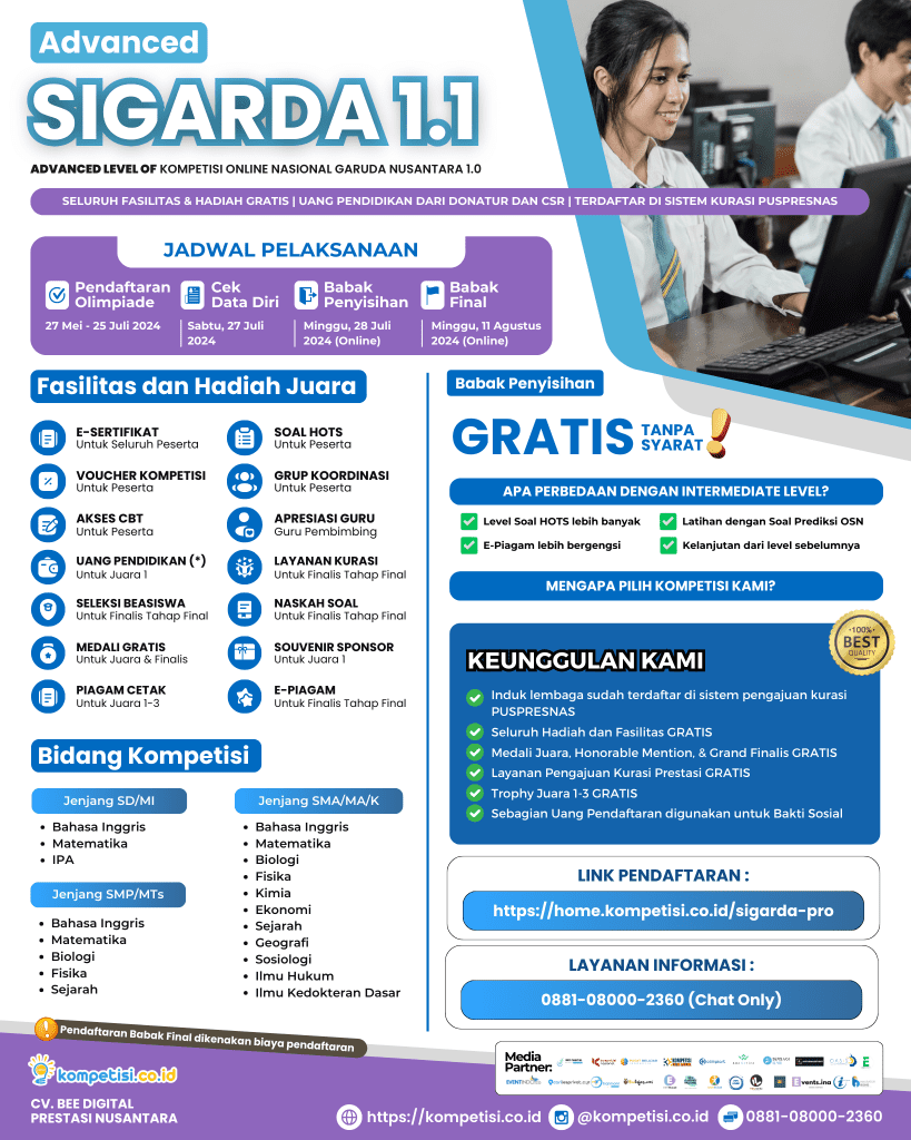 SIGARDA 1.1 (ADVANCED LEVEL OF KOMPETISI ONLINE NASIONAL GARUDA NUSANTARA 1.1) merupakan kompetisi yang diselenggarakan oleh CV. BEE DIGITAL PRESTASI NUSANTARA untuk pelajar SD-SMP-SMA di seluruh Indonesia.