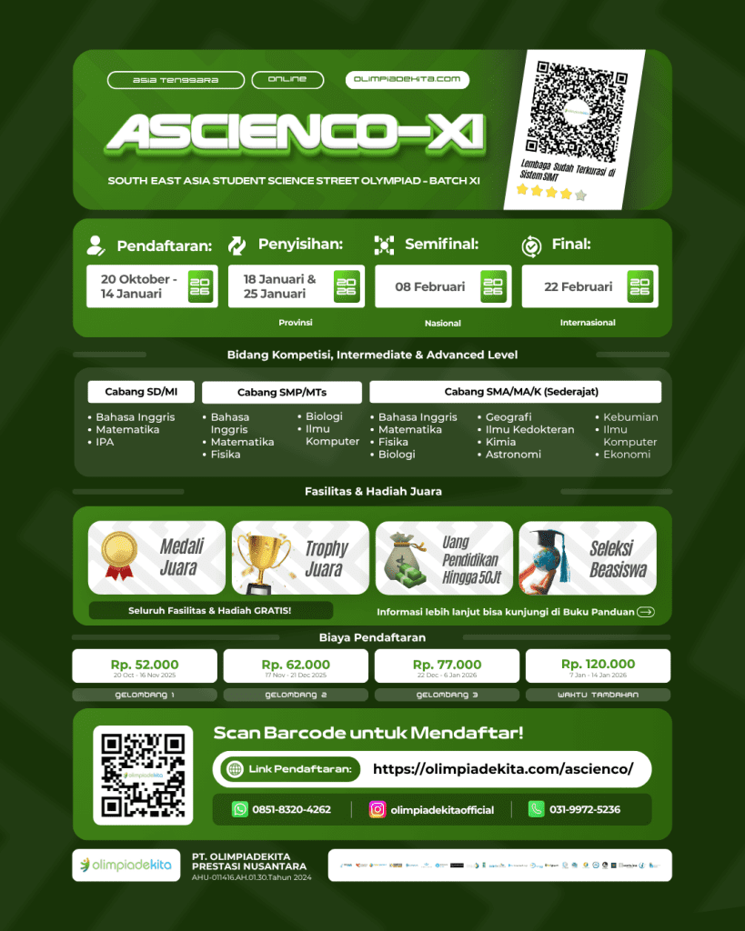 Tingkatkan peluang lolos sekolah favorit! Piagam Ascienco bisa digunakan untuk PPDB, dan diselenggarakan oleh lembaga yang sudah terdaftar resmi di SIMT, sehingga prestasimu diakui secara nasional.