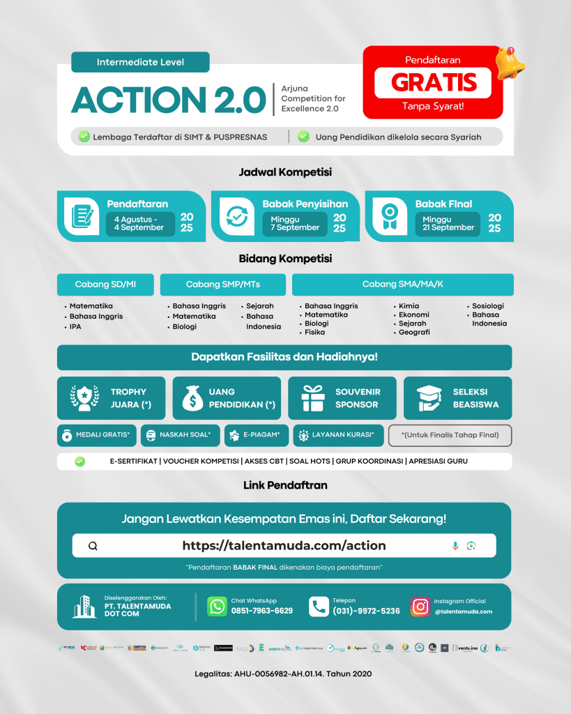 ✨ Jangan lewatkan kesempatan emas untuk menjadi bagian dari Arjuna Competition for Excellence (ACTION) 2.0 – Intermediate Level! Kompetisi ini akan dilaksanakan pada 07 September 2025 secara daring dan GRATIS, serta terbuka bagi pelajar dari seluruh Indonesia. Tunjukkan kemampuan terbaikmu, raih medali, piagam resmi, hingga peluang beasiswa, dan buktikan bahwa kamu adalah generasi berprestasi yang siap bersaing di tingkat nasional!